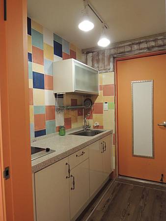 進門就可以看見簡易廚房~也有鍋碗瓢盆可以自己煮東西