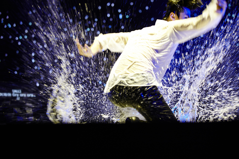 從他身上滑落的水珠還有他看似傷心無意的踐踏那水池裡淺淺的水
