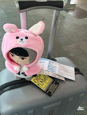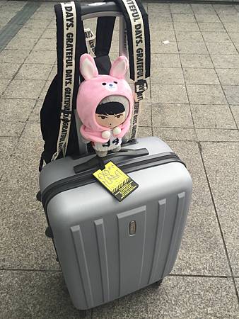 咚咚的機場時尚~ 他怕冷所以保暖為主!! 新買的斗篷超可愛♥ 一旁亮黃色的行李吊牌是東京限定版^^