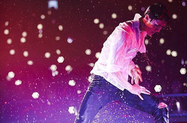 水舞一開始,全場暗燈之後,只有左側(也就是忙內)這側有打燈,聚光燈在諾大的體操競技場中
