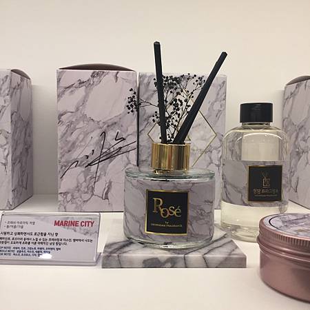 店內還有洋基蠟燭跟融燭燈,他們家的融燭燈在做特惠,大理石的質感很優秀有點心動,但礙於重量問題我就放棄了。店內只有我一個客人,老闆大概也猜到我是為了吳世勳來的,就開始跟我聊天~人蠻親切的,習慣了不親切的韓國店員之後反而有點不習慣親切的老闆!而且他那臉是我喜歡的型~喝ㄏ !頭一暈就買了!展示櫃擺設很美!盒子上有我們忙內的簽名~他好像喜歡這種一開始有種很嗆的味道(個人感受)的調性,之前洋基蠟燭櫻桃口味婷不喜歡那個味道~但是我是覺得燒起來只有櫻桃味!沒有像一開始聞到的藥水的味道~就蠻喜歡的!洋基還是喜歡伯賢的口味大眾接受度比較高!Marine city 這款擴香感覺很男人!呵呵!不是因為他在用我才這麼想的,是真的很男人~但是另一種他也有買的是(捧花)香調~那款就很女孩兒甜甜的花香~其他所有的味道我都有聞過!但是腦殘就是要同款所以我沒得挑!去之前想說如果有超級喜歡的其他香調我也會買,但是這香氛品牌沒做到讓我掏出其他錢的地步。