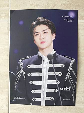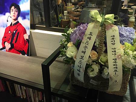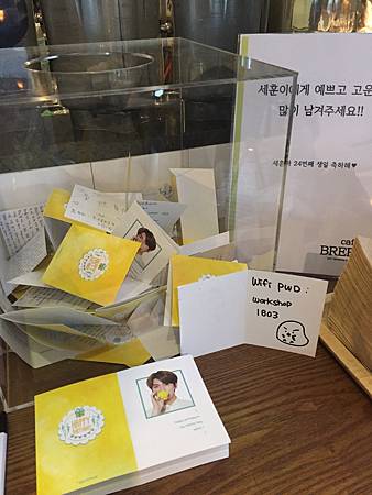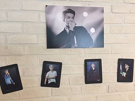 咖啡廳靠窗的位置都貼滿了吳世勳戴花環的海報,充滿春天氣息好粉嫩,進門處是一個小攤販販售周邊,然後是咖啡點餐區,入場卷有含一杯咖啡的錢很值回票價,領餐區的旁邊是放了給世勳的生日應援卡,自由填寫之後可以統一送給世勳,我當然也有寫一張~但是寫了什麼好像沒照相也忘了!只記得是寫中文的^^想要顯眼一些^^店裡的擺設都很用心!牆上貼滿了大大小小相筐不說,桌上也隨處可見花&世勳的照片~每個愛麗都帶了一兩個兒子來拍照,咖啡廳瞬時間變成幼稚園的熱鬧感!最大的一面牆上隨時放著站長拍的短片,只有影音而已,BGM自然是孩子們的歌!去了之後才發現原來your breeze不僅僅是拍影片跟掃圖而已,有跟拍的場次蠻多的,重要的大場合?都有去,只是可能我之前沒有發摟她,或是他沒有放出高清照。