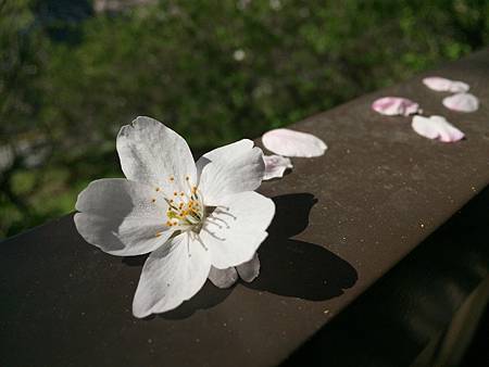 這邊的櫻花樹不知道是向陽還是怎樣,比起兒童公園的花較早開的樣子,風一陣一陣吹,花瓣就一陣一陣飄落下來