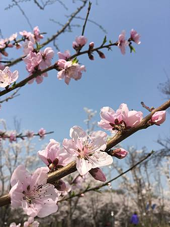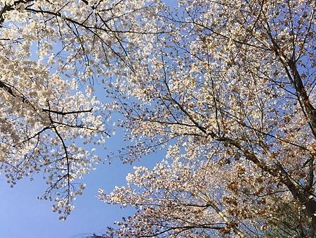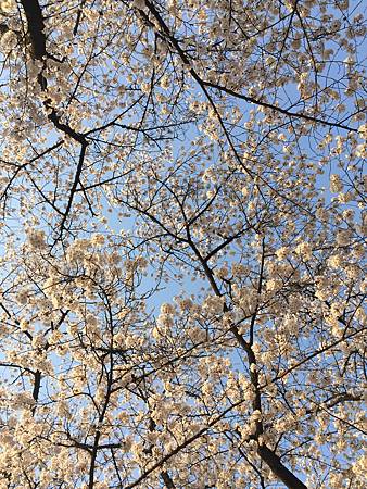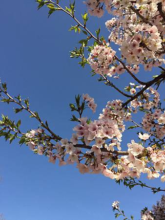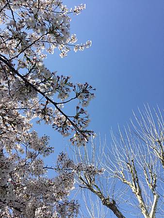 從日常工作抽離的一週賞花行,IPHONE拍的藍天白雲都好美喔!一旁的白楊樹跟雪白的櫻花襯的天空藍透了