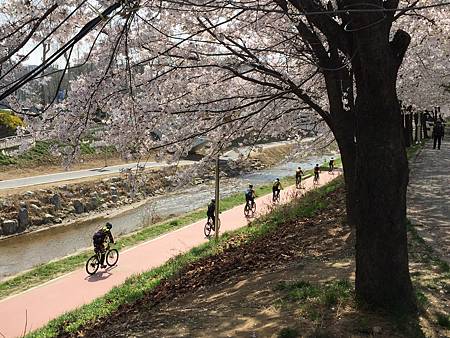 很悠閒的~一邊看著河岸的水波!櫻花路比較高一點喔!有點類似提防的感覺?