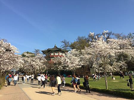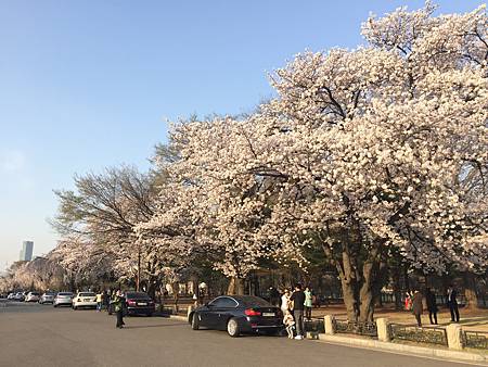 四月的首爾中午還是蠻熱的~今年開花預測是4/7我是4/12號去的!是滿開。今年蠻準確的。