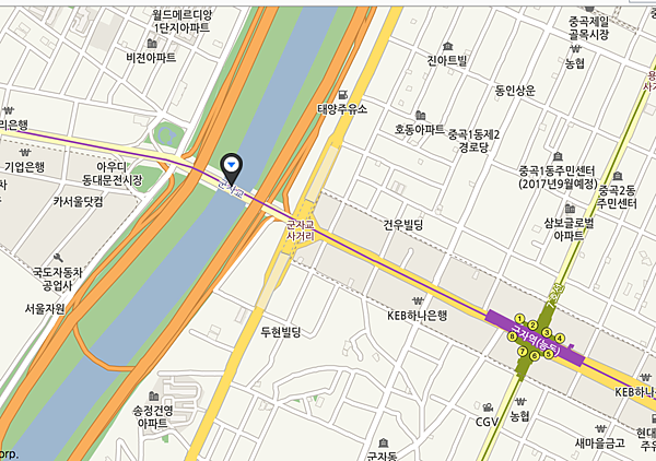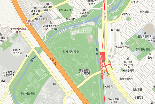 一直往前走不久可以看到白色的橋就是公園了。我自己是從江南坐小區公車「束草20號」去的,公車很多都會到,就在「市民之林」下車即可。
