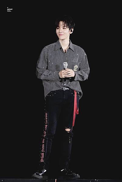 最初靠近我們區的成員是伯賢&大哥,伯賢在花道前整個未免太帥吧feat. 自然光,下巴線條帥到令人無語,變色片不用望遠鏡用肉眼就看得到,自然光下加上春風在吹白白的髮流啊。我第一次當場就可以看到成員們的變色片!還可以看到是什麼顏色~坐的位置不是特別近,單純因為天色很亮所以變色瞳片很顯眼顯色!
