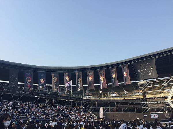 開場天還亮著著,比想像中開的少的block,跟京瓷還有東蛋比較,蓋黑布的地方比較多,東蛋根本是開整場了。在競技場的前方掛著九個人的布幕,我昨天路過競技場明明數了人頭是八個人,演唱會當天卻是九個人~呵呵。大海報隨著暮色降臨顏色變換很令人心動,夜晚打了照明也很美。