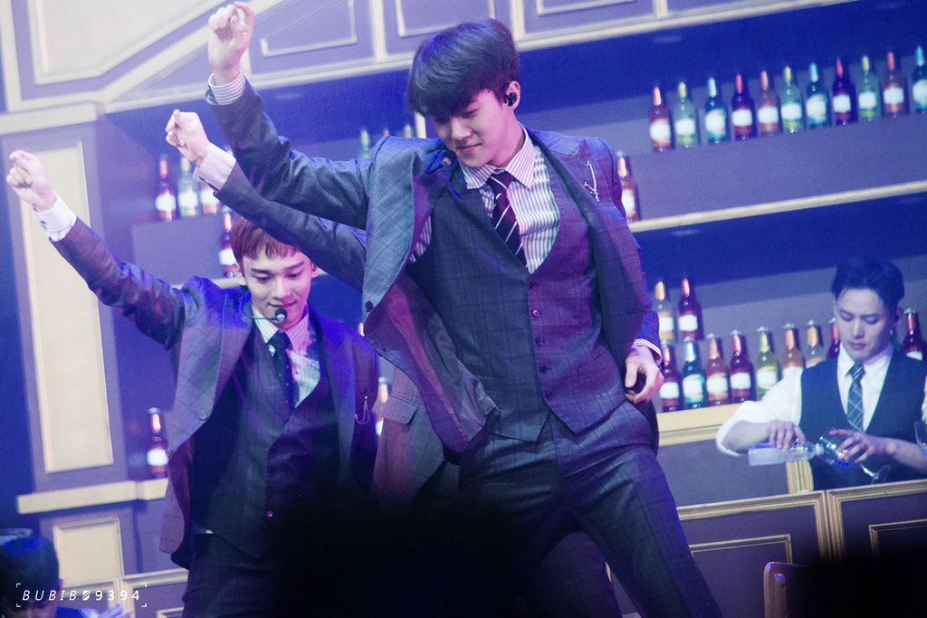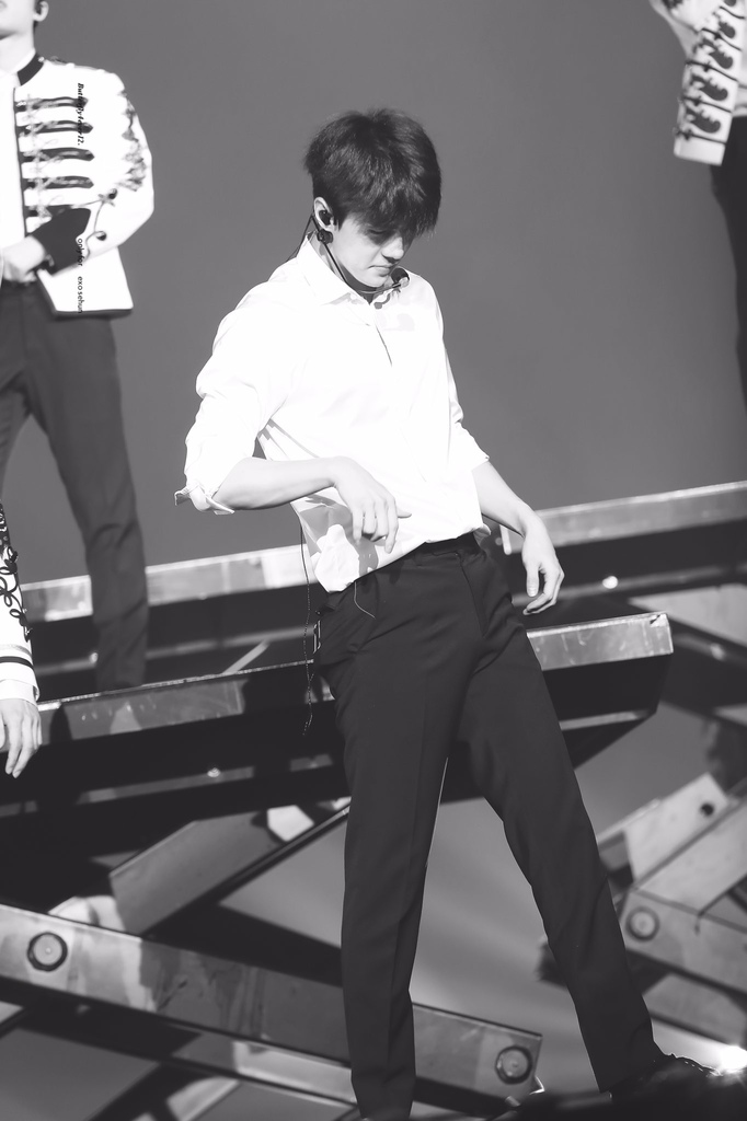 咆哮的時候,吳世勳升降機高起來的時候,他的腿真的無限延伸,大腿看起來超長的,白色上衣沒有穿外套???為什麼他不穿外套????脫掉為什麼這麼帥????他是白馬王子嗎????另一首歌的時候也是~脫外套全白的!誒。。。