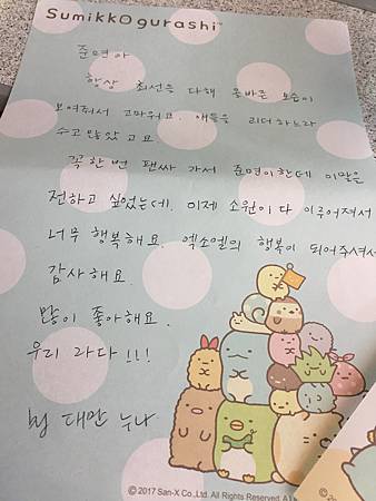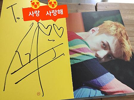 有種腦子與魂魄分離的那種即視感,我聽不懂自己在說什麼,我在說話,我在說韓文,可是我自己也聽不懂我自己在說什麼,這情況實在很罕見!當我最後組織好語言,燦烈突然很精靈的聽懂我在說什麼就開始寫,我叫他幫我寫心動一句話!我到家之前不會看 就這句話反覆說了不知道幾次,哈哈哈哈!我學韓文快十年的屈辱的一天啊!哈哈到底在說啥???但至少我有說出來了!燦烈很快地寫著字,低著頭!我看著他的頭^^一邊喵著左邊的嘟嘟 還有右邊的鍾仁