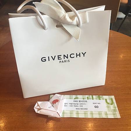 新村公開簽名會不能親手送禮物,週五的時候認識個中站妹子他說請我幫他轉交一個他已經看好的手機殼!我沒想那麼多就答應了!一個小小的手機殼也不算什麼,原以為是路邊手機店的可愛手機殼什麼的,結果一拿來是紀梵希,哈哈哈!果然人家送禮都是送名牌我去查了一下是五六千元的手機殼!我都送餅乾糖果 哈哈哈!說實話我買專輯花太多錢了沒那個閒錢再去買很高檔的禮物,送太便宜的又不符合他們的身份,只好送點吃的了!吃了就好~沒吃丟掉也不心疼。手上身上也不能帶東西上去,都被要求放在位置上,我帶了RYAN手圈也說不行,呵呵呵。