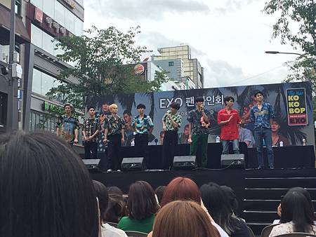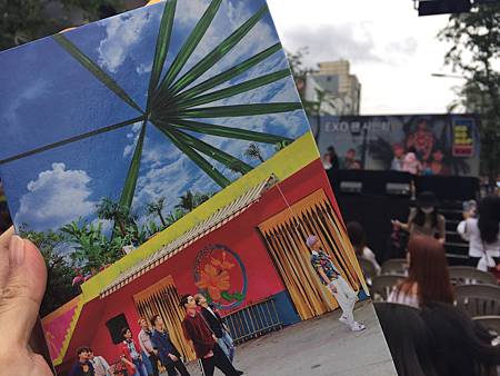 知道孩子們錄完人氣歌謠來的,大概會穿打歌服來,世勛穿著打歌服藍色鳳梨裝來的時候我好開心!喜歡他比較愛豆的模樣^^整個人整理的很好的感覺^其他孩子們也是,尤其燦烈肩膀好寬一直注意到,此時新村雖然很熱鬧壅擠但是秩序還好,不至於要重新退場再來什麼的,十字路隔壁的咖啡廳!一二三四頂樓陽台幾乎都是愛麗們攻佔,人手一支大砲在拍,我就很放心地交給他們拍,自己就錄音就好。我一直因為錄音這件事很緊張,但是反正保安大哥沒時間看我,他們要維持現場秩序,比起星期五我比較有勇氣來錄一下^^這天的座位跟週五不一樣,但頭尾蠻像的,我馬上又把便利貼順序對調了,順序是這樣